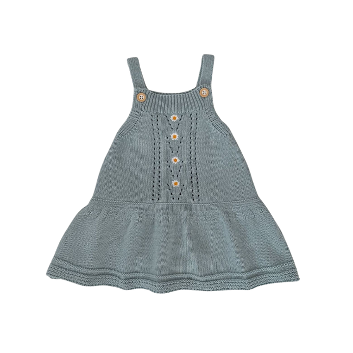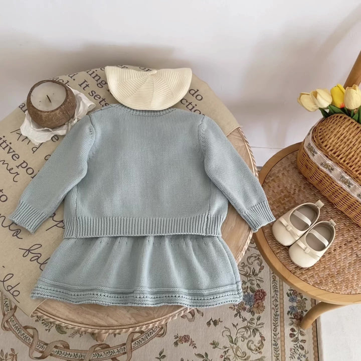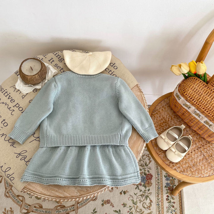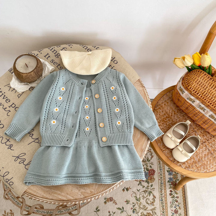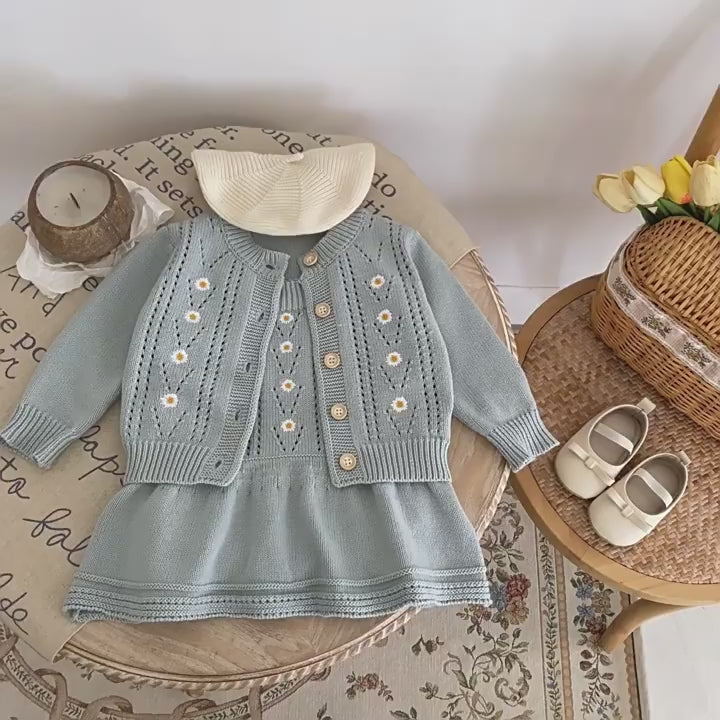 Daisy-Embroidered Knit Set | Dusty Blue Cardigan + Lace Knit Dress | 0-3Y Baby Girls (Fall/Winter)